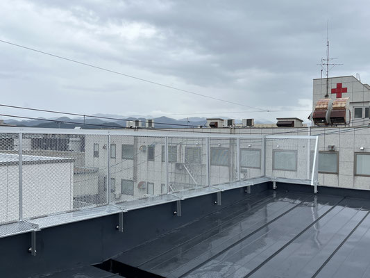 パネルの高さが90cmのため標準装置よりも肉厚部材の使用と ワイヤーで6箇所 を固定することで耐風圧に耐えられる雪庇防止装置を施工。